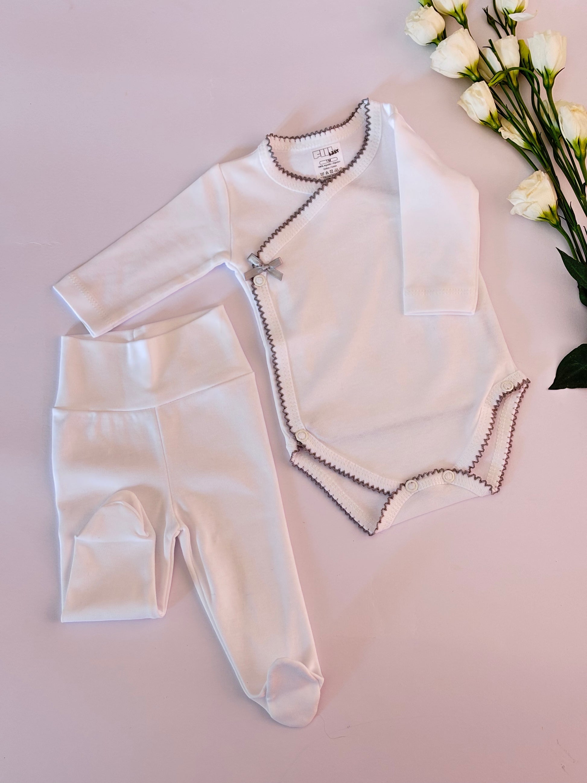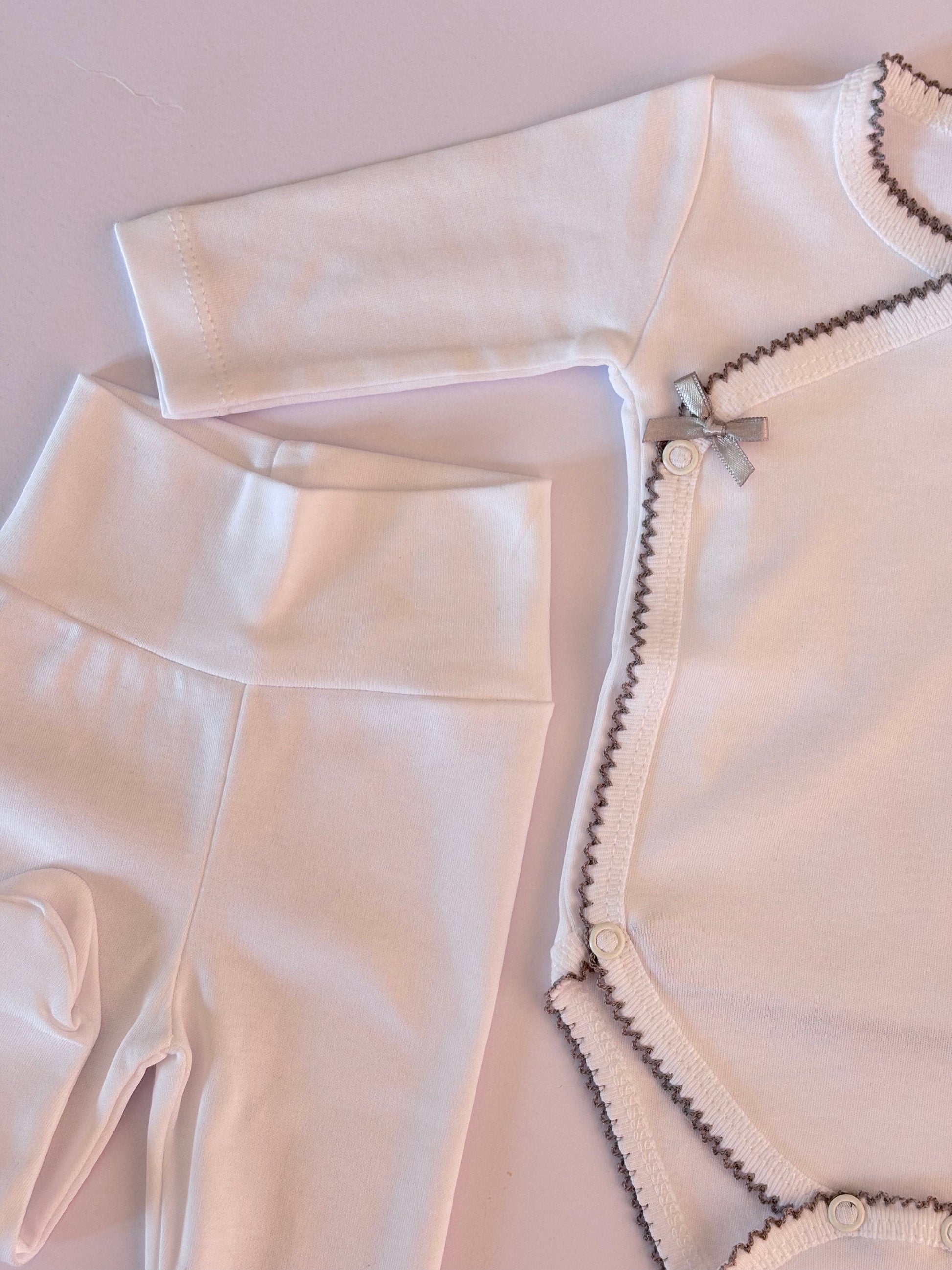 Set due pezzi. Body con coulisse grigio in cotone + pantaloni