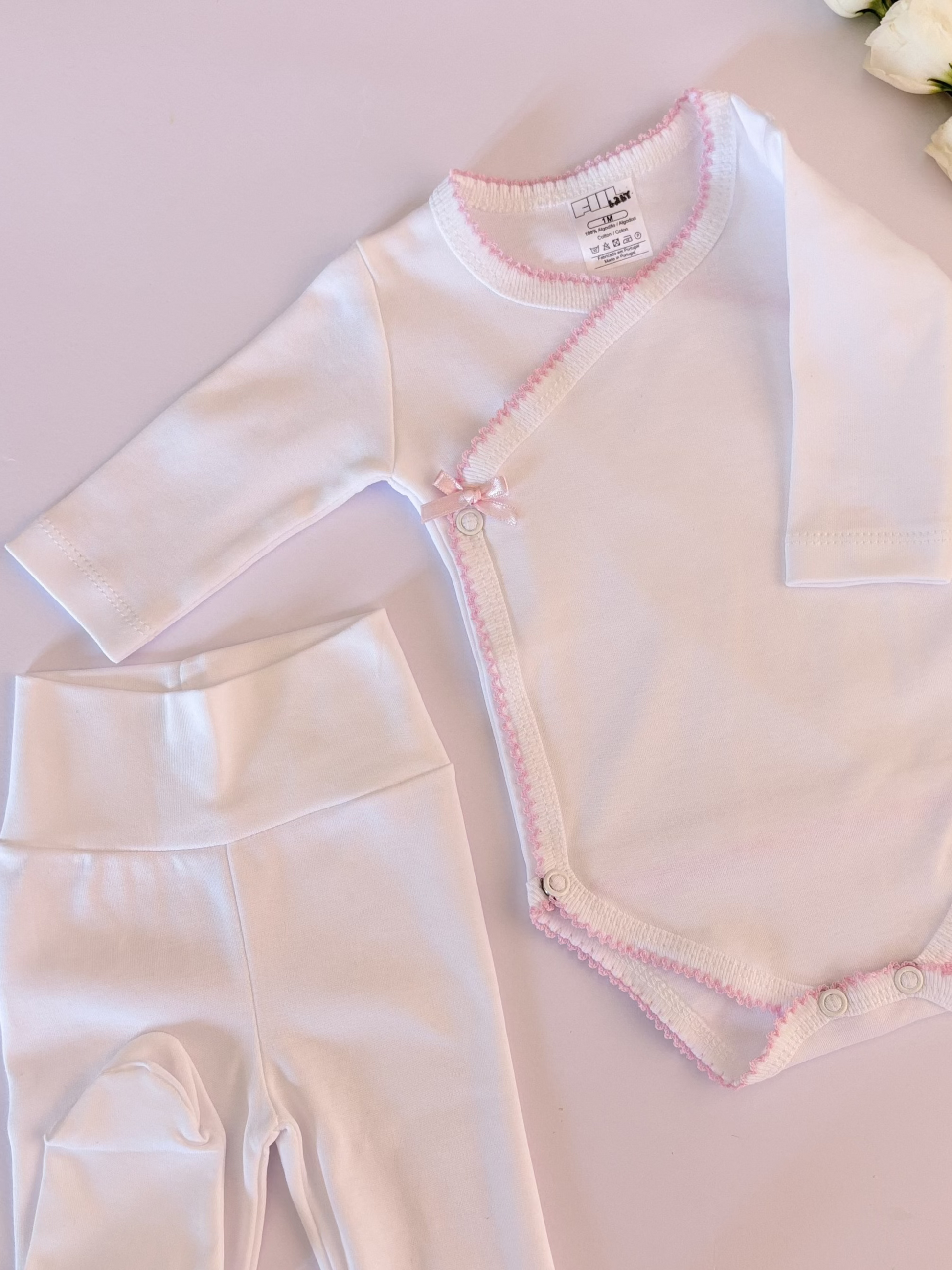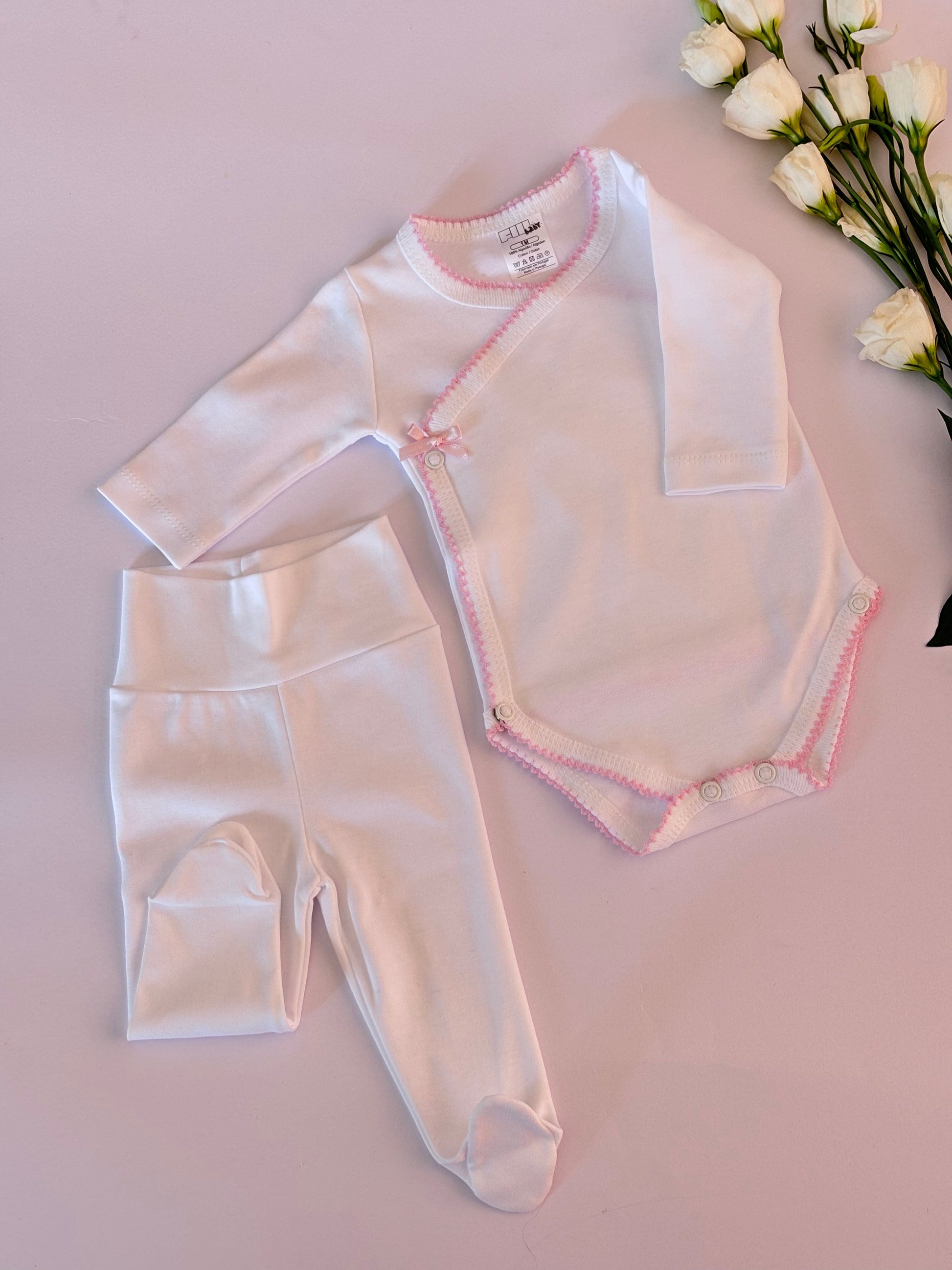 Set due pezzi. Body con coulisse Rosa in cotone + pantaloni