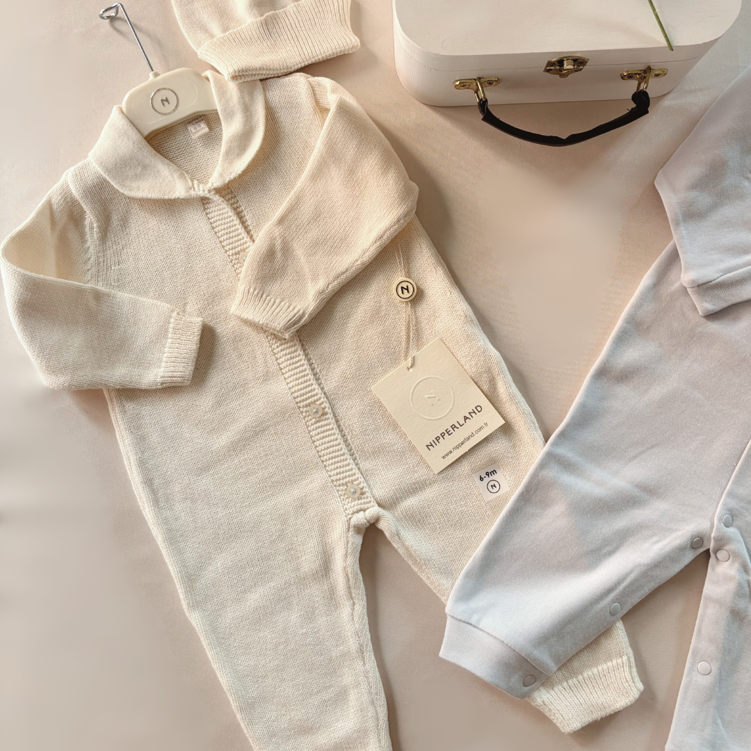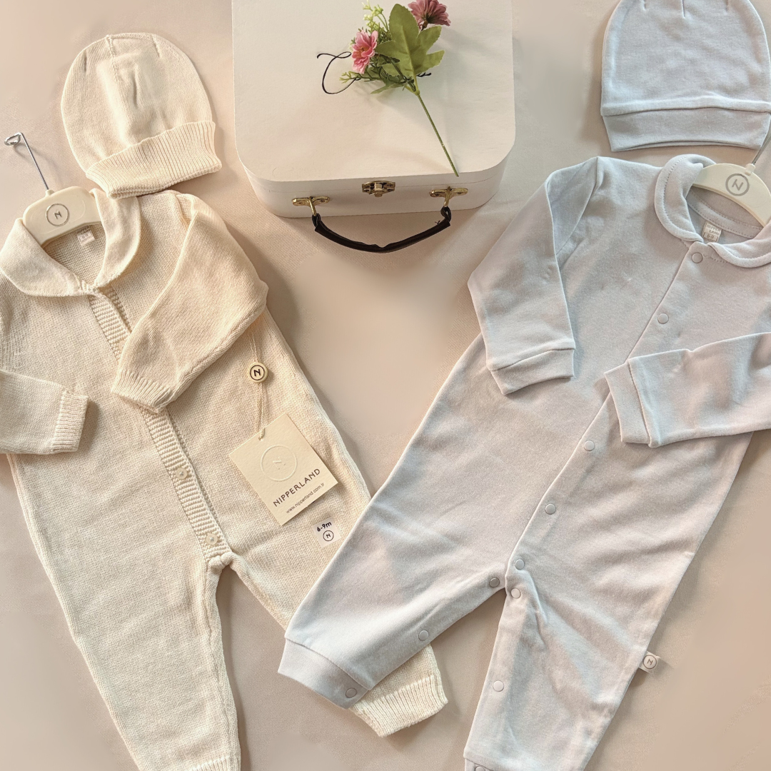 Questo set da 4 pezzi di Nipperland, realizzato in puro cotone biologico, è perfetto per offrire comfort e stile al tuo bebè. Il set include un pagliaccetto azzurro con pratici bottoni automatici sul davanti per una facile vestibilità. A completare il look, c'è anche un berretto abbinato dello stesso colore del pagliaccetto. Inoltre, il set comprende una tuta in maglia color crema, impreziosita da un delicato motivo blu o rosa sul petto, con un cappello in maglia coordinato, anch'esso con lo stesso motivo della tuta.