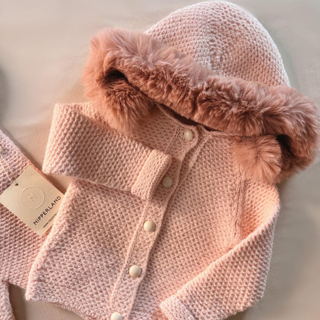 • Giacca in maglia con cappuccio, rifinita con un bordo in pelliccia, ideale per tenere il tuo bimbo al caldo e al tempo stesso elegante.